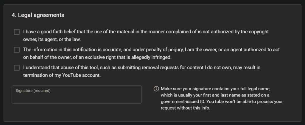 Note that when you submit a DMCA takedown notice on YouTube, you start a legal process. Because of that, if you submit false information, you may face perjury charges. On top of perjury charges, the person you send the notice to may take civil action.